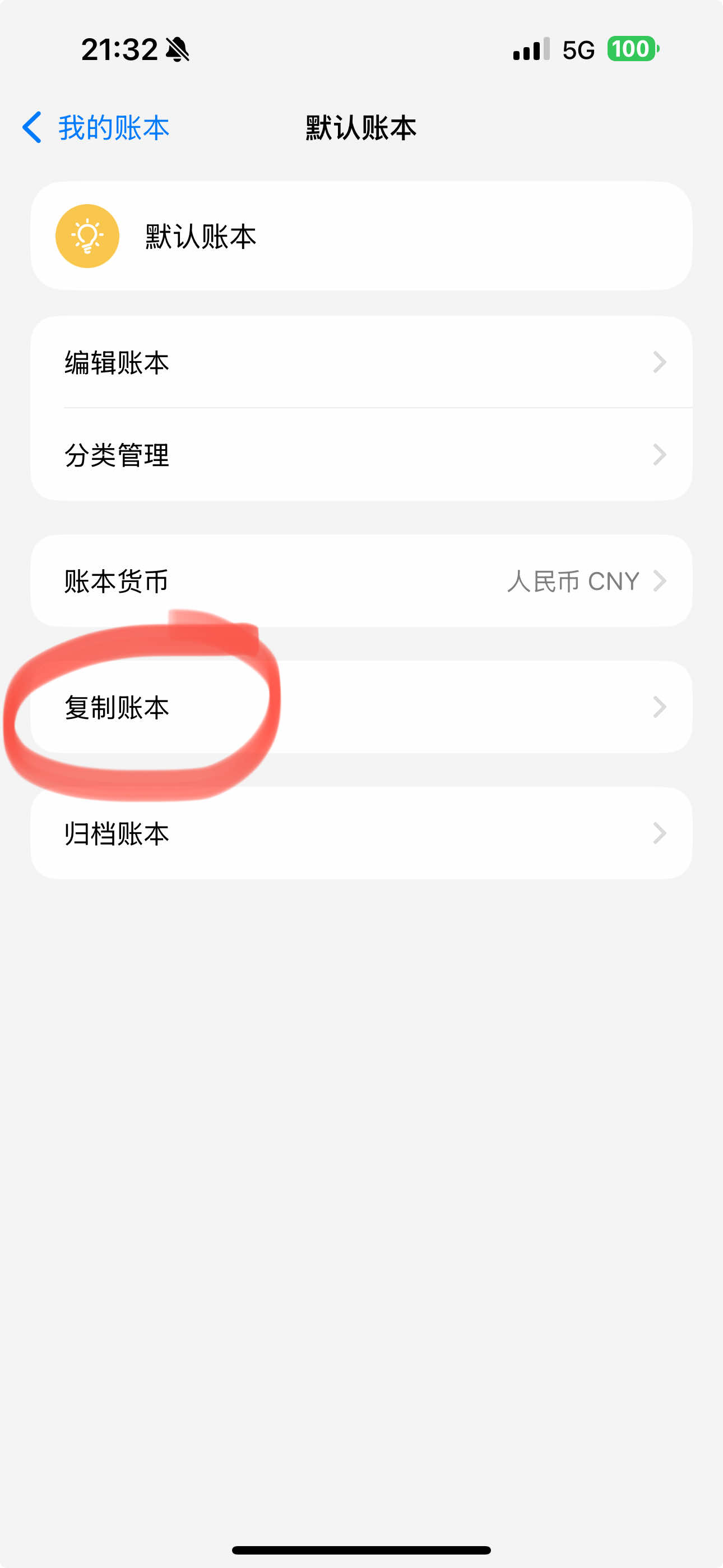 点击账本项目的菜单按钮,会出现复制选项。点击即可复制。